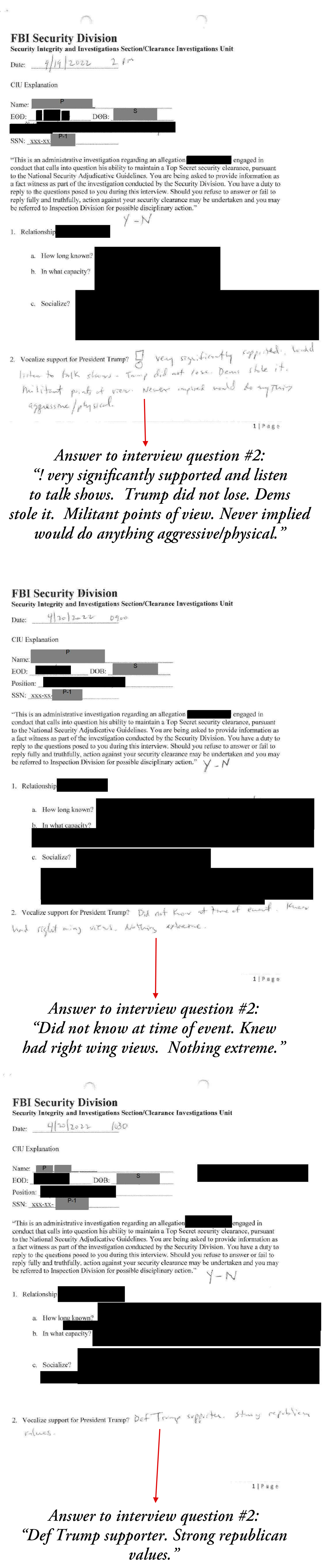 These questionnaires were used while interviewing FBI agents who were familiar with the suspended agent to determine the future status of his security clearance (which is still pending). Question #2 on this questionnaire was, “Vocalized support for President Trump?” The responses noted by the interviewer are highlighted below.
