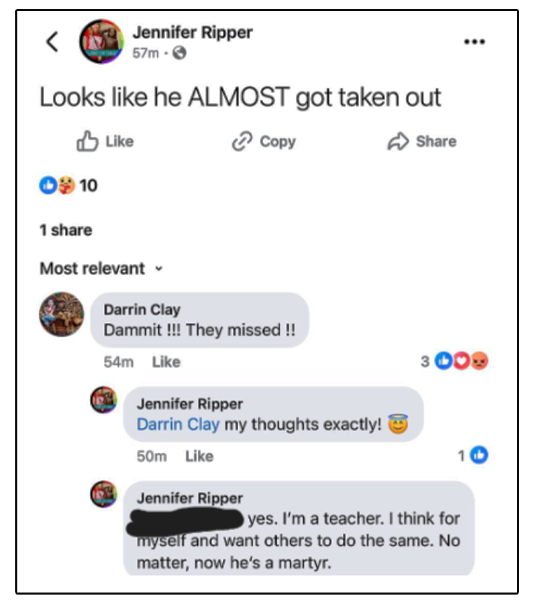 On the same day, Jennifer Ripper, a special education teacher at an elementary school in Colorado’s Jefferson County School District, also took to Facebook to express her disappointment that Trump was not executed.