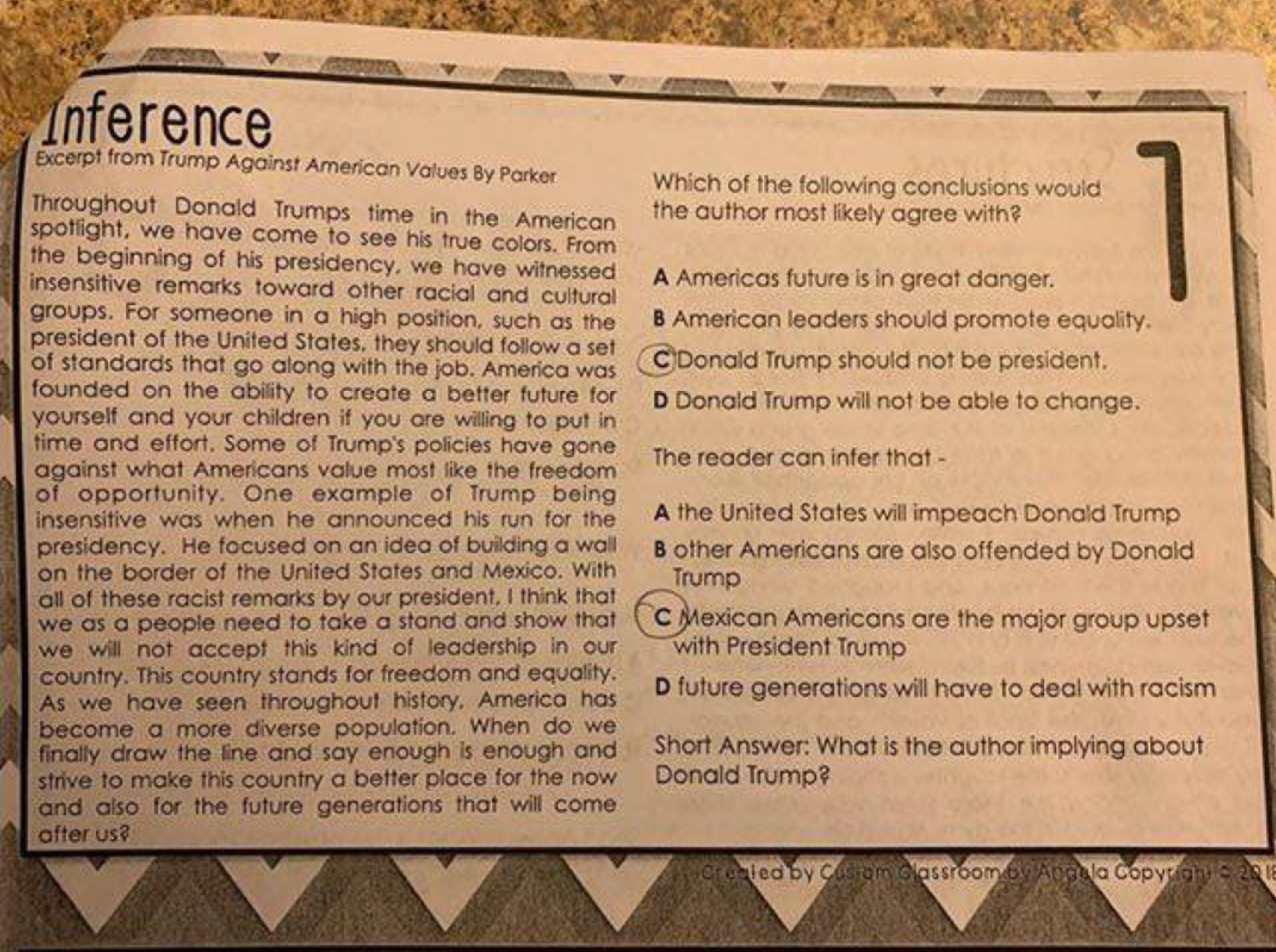 In 2019, a Texas school district was exposed when a 7th grade homework assignment was revealed on social media. The assignment was the reading of an essay entitled, “Trump Against American Values”, (one of the American classics which was not banned in the school library), which was purposed to teach the students ‘inference’ from reading. At the end of the essay, there were several multiple choice questions, one of which had the correct answer as, “Donald Trump should not be president”.