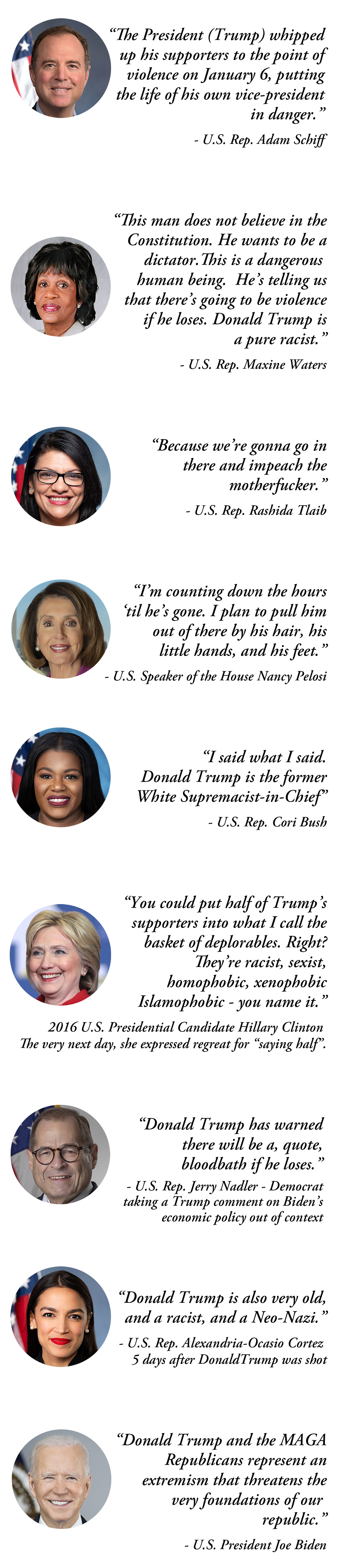 Members of Congress have not only called Donald Trump every one of these libelous labels, but some have even gone so far as to threaten him with violence. And these unfounded attacks are not just toward Trump; they include his supporters as well. Over and over and over and over again, they spew the MAGA extremist Narrative.