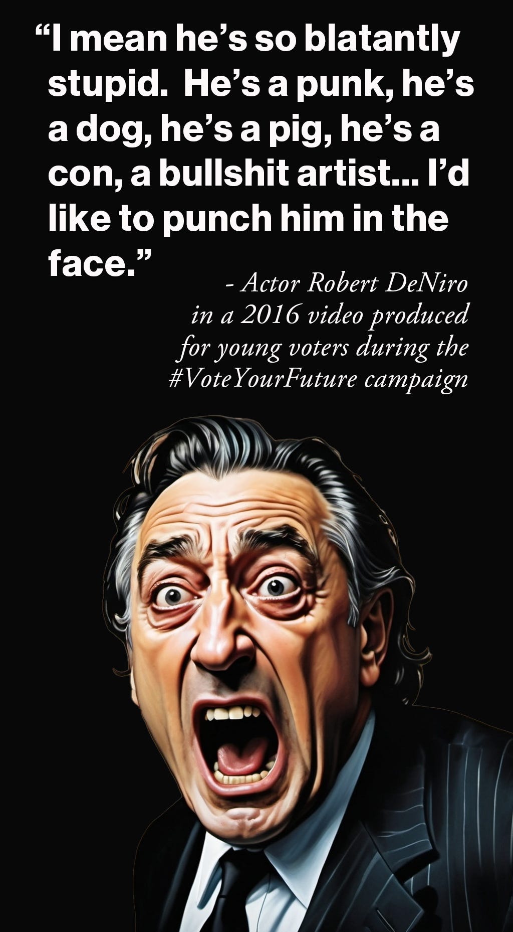 “Fuck Trump! It’s no longer ‘down with Trump’. It’s Fuck Trump!!” - this was during the 2018 Tony Awards. The entire audience of Hollywood Derangement jumped to their feet to give DeNiro a standing ovation while the actor pump his fist in celebration.