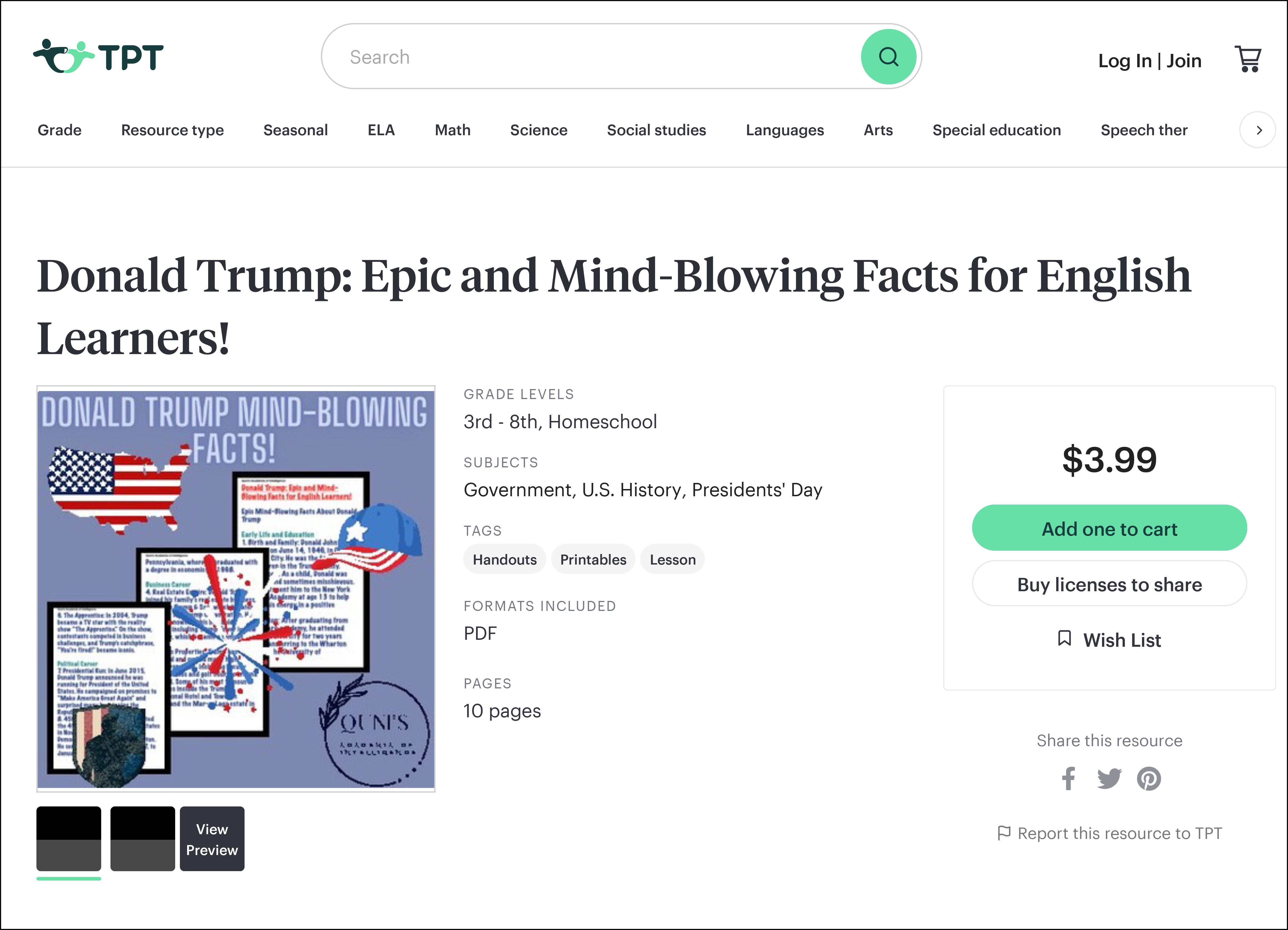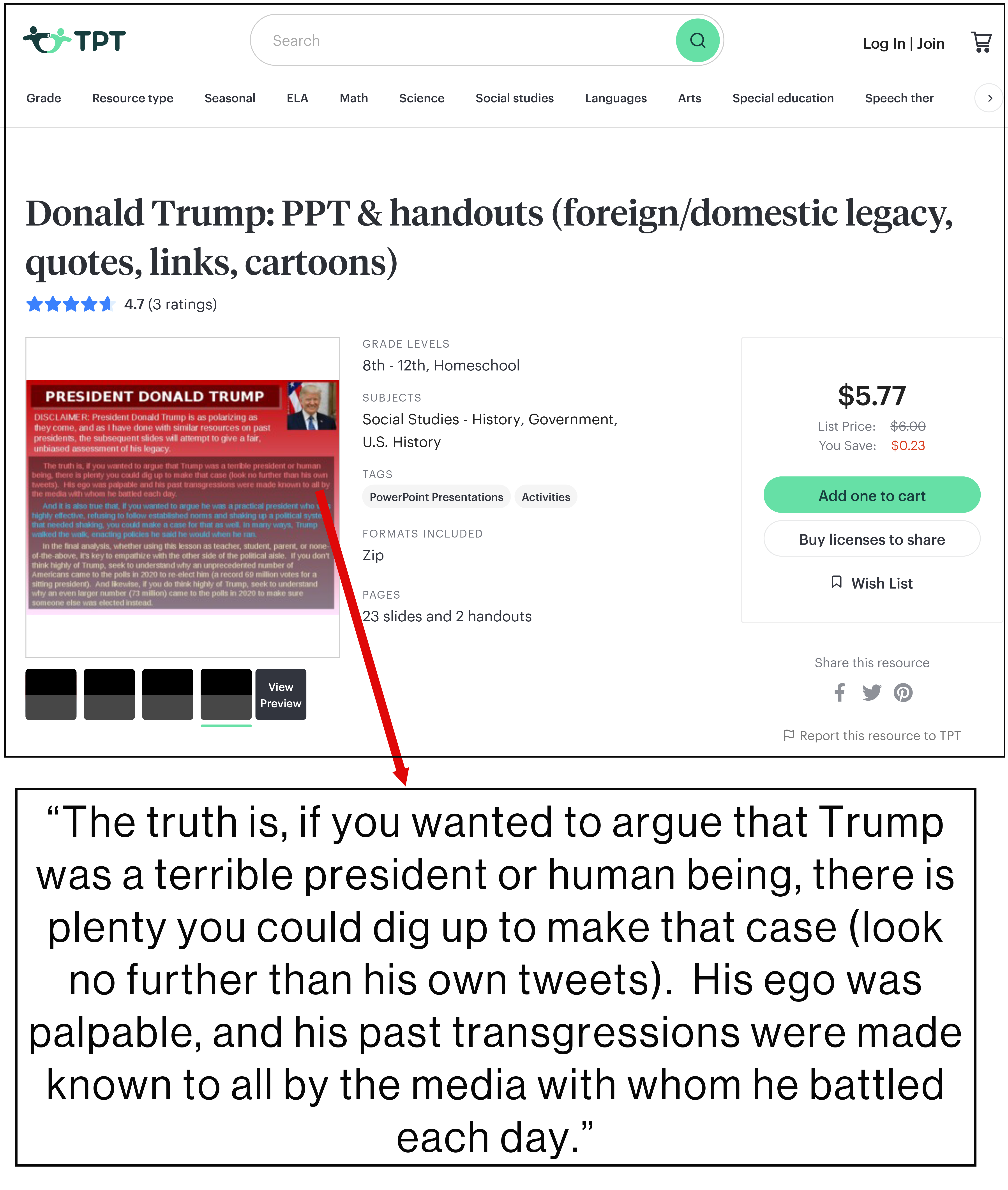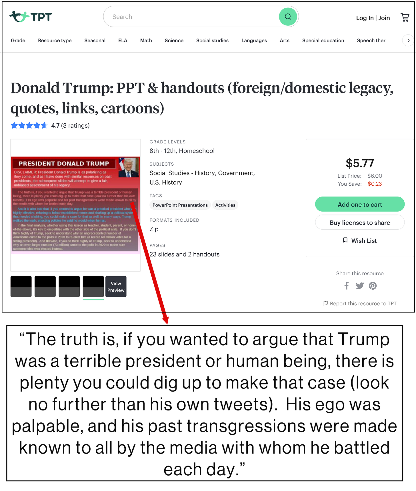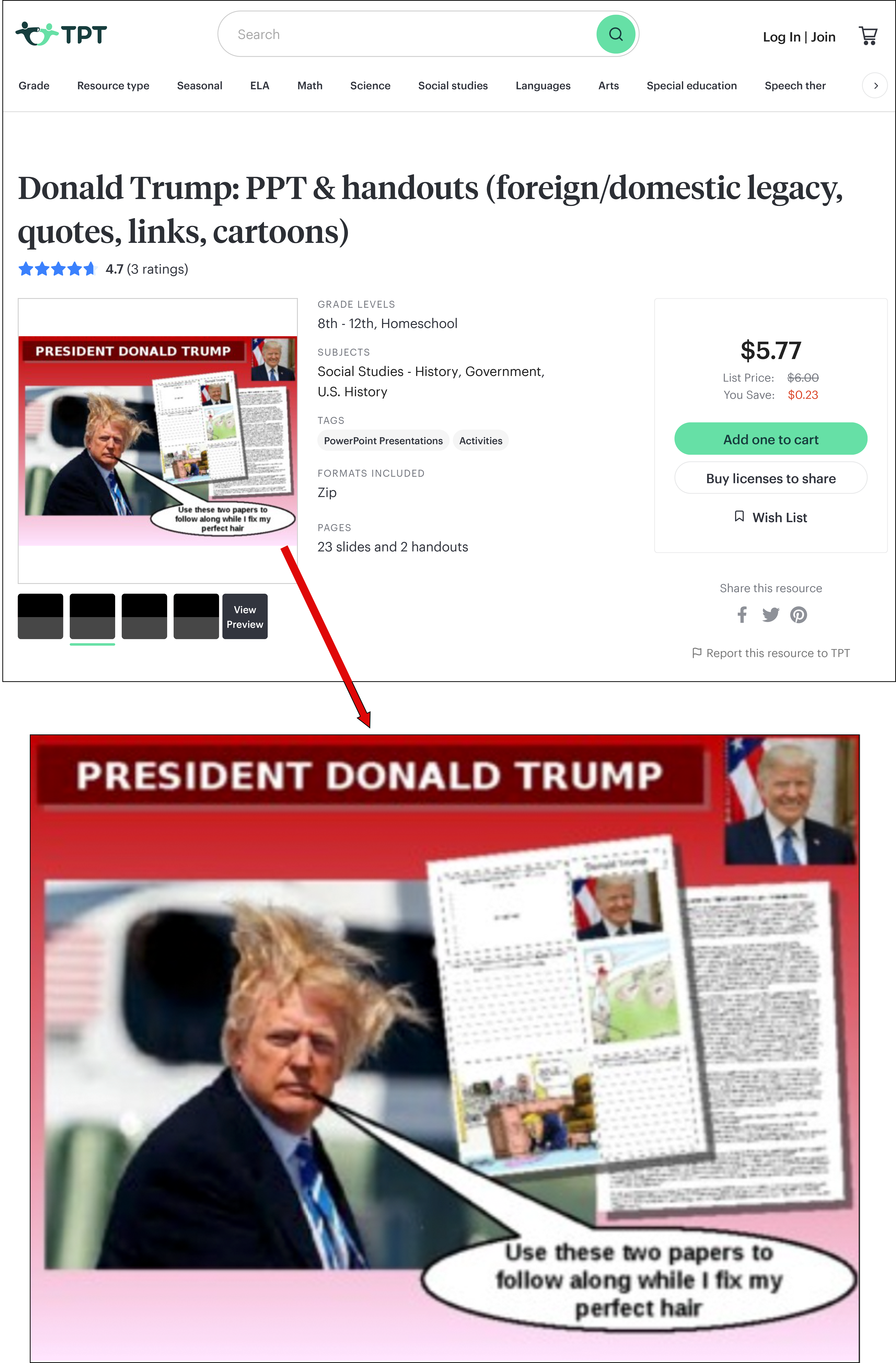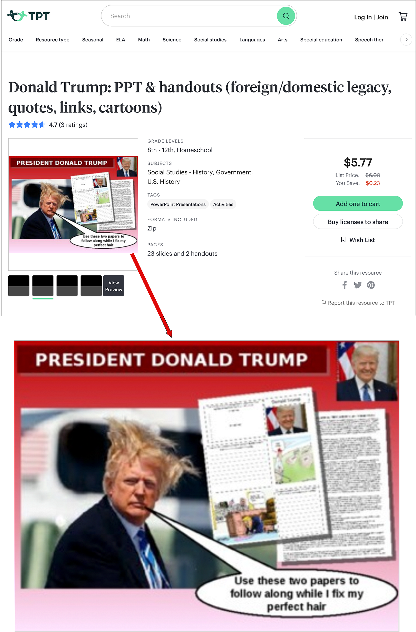 Upon further investigation, I found that this particular teaching module was sourced from a company called “Custom Classrooms by Angela”, and distributed online at a website, www.teacherspayteachers.com, so naturally, I had to see what other Trump Derangement modules they had to offer.