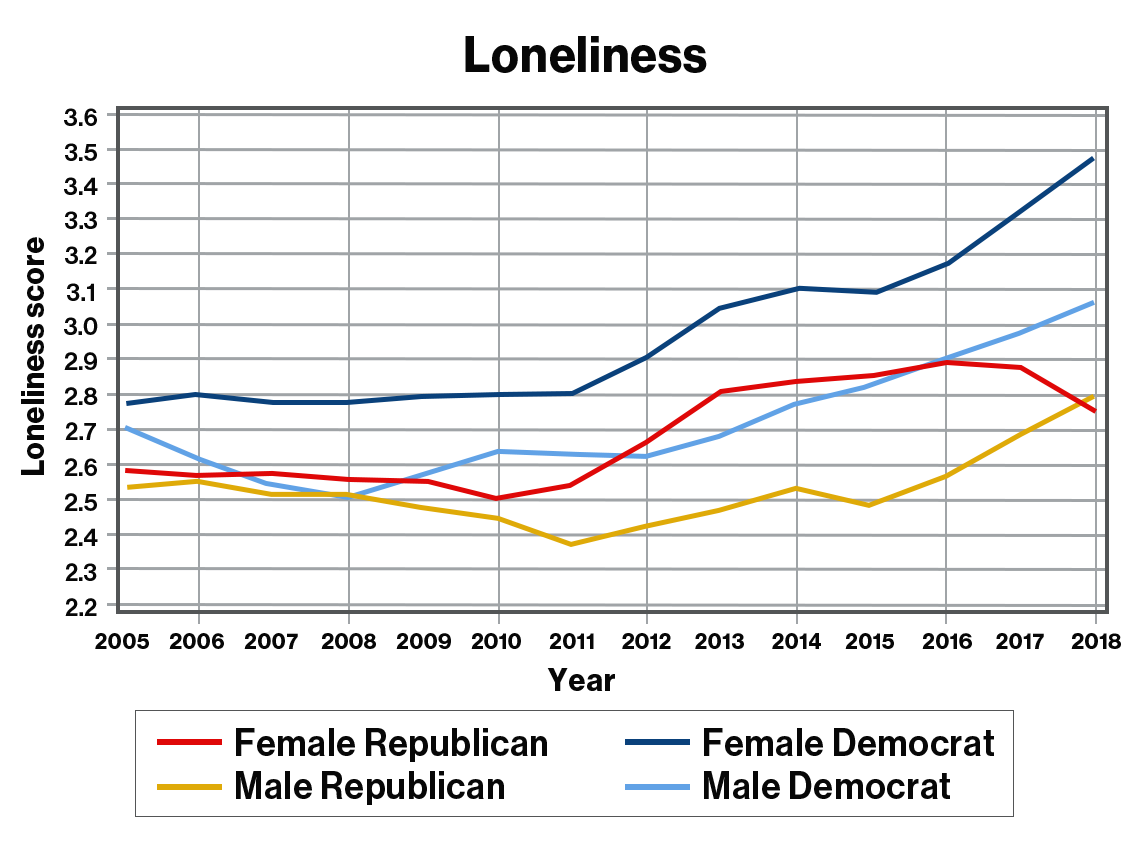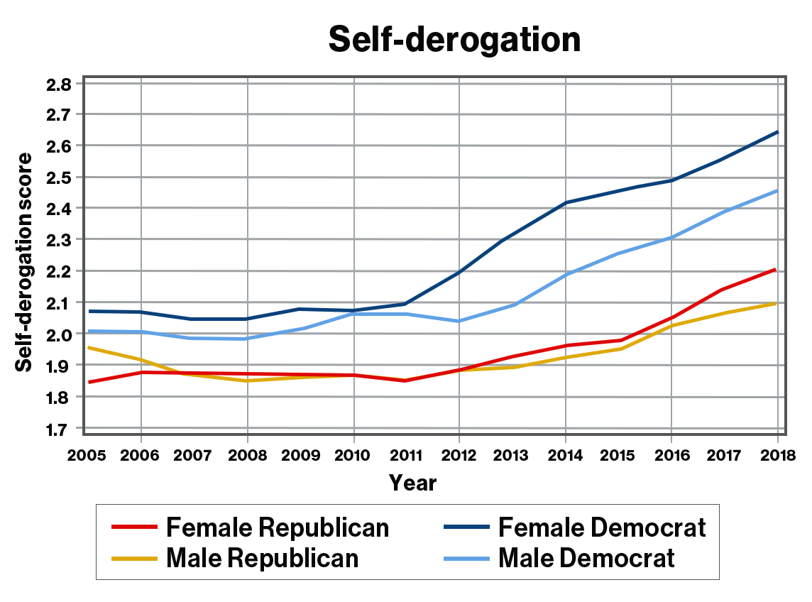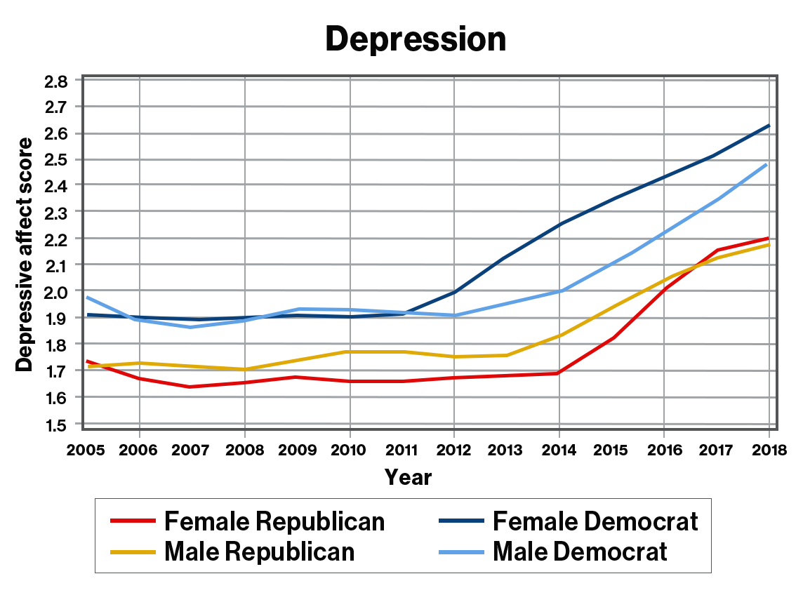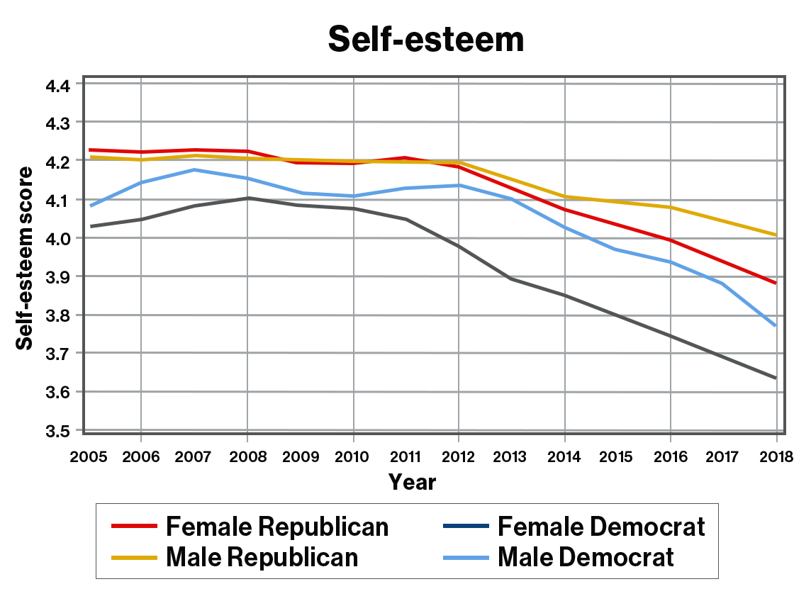 In the graphs below, (Appendix Fig. A.1 through A.2.1. of the study), you can see that 12-grade students who identified as liberal Democrats (particularly those that identified as ‘female’) were prone to higher levels of depression, self-derogation, feelings of loneliness, and possessed lower levels of self-esteem.