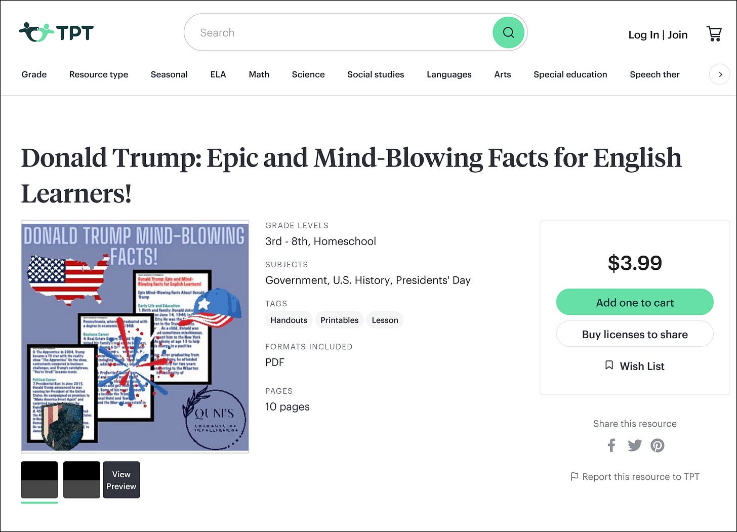 Another interesting teaching module was, “Donald Trump: Epic and Mind-Blowing Facts for English Learners!” This presents an excellent way to indoctrinate the millions of children who just recently migrated to the United States, and consume the Democrat Derangement of Donald Trump.