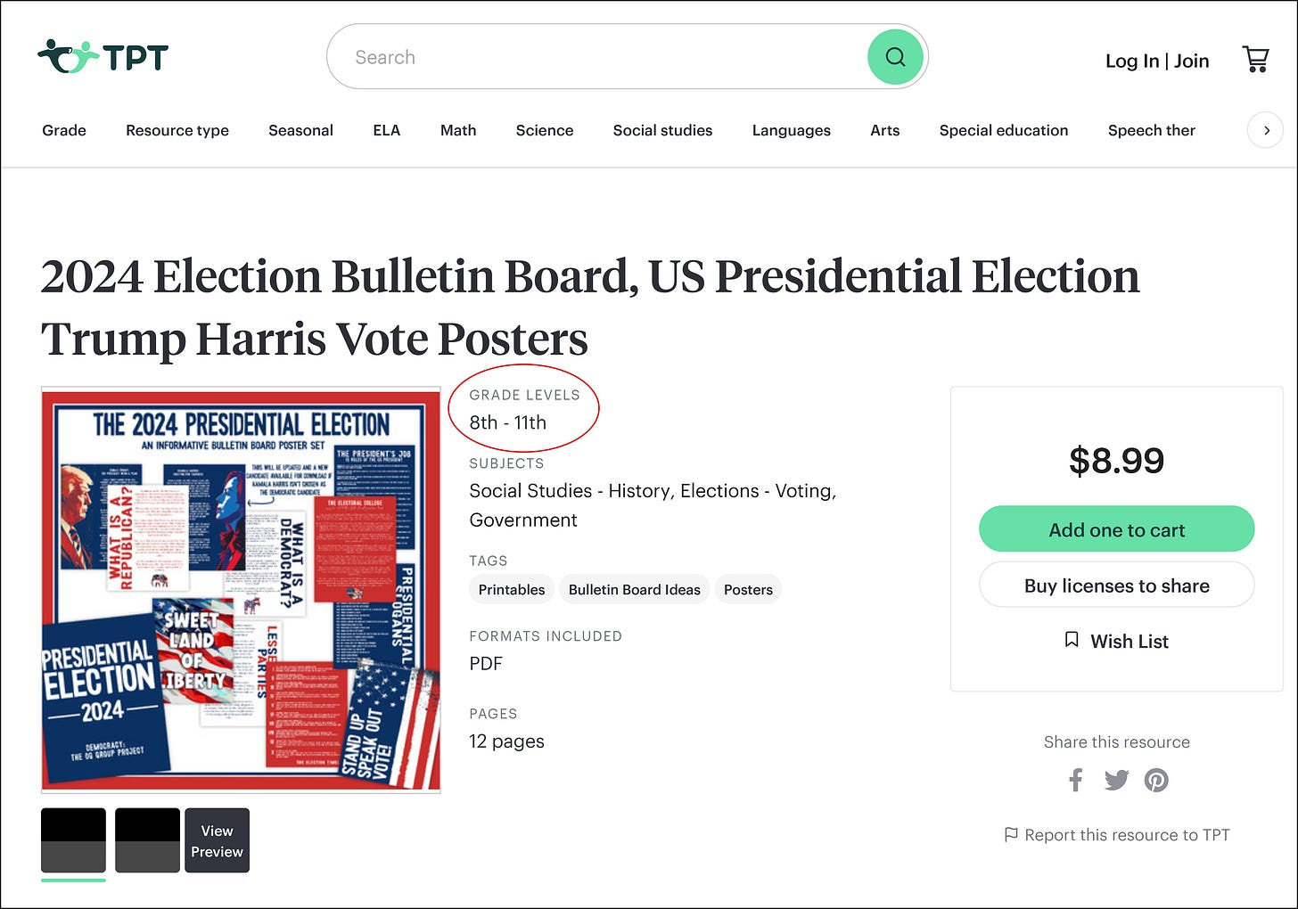This particular teaching module was prepared for students in grade levels 8-11. Included are two posters: one of Donald Trump, and one of Kamala Harris. When presented and explained by, oh…let’s say a teacher that posts Derangement on Facebook, which candidate do you think the students go home and stump for?