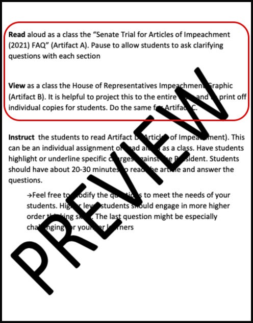 “Read aloud as a class the “Senate Trial for Articles of Impeachment (2021) FAQ” (Artifact A). Pause to allow students to ask clarifying questions with each section”