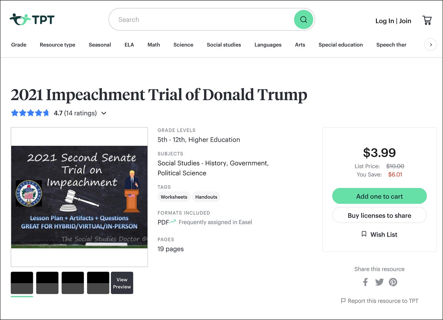 Another educational module is entitled, “2021 Impeachment Trial of Donald Trump”. This was prepared for students in grade levels 5-12, as well as higher education programs. Note the instructional manual in the second box below on how to present this lesson: